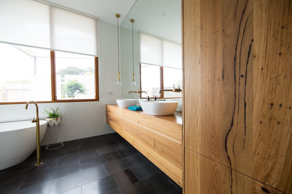 An Avoca timber vanity was installed in each of the bathrooms of this beautiful home. The colour scheme of white, concrete, and black was continued throughout the wet rooms, and wooden vanities were added to provide a warm and luxurious touch to these spaces. The client chose recycled Messmate for the project, with a low to medium sap line feature level. The subtle sap lines ensured that the timber vanities would stand out in the bathrooms without visually dominating the space. A wooden bathroom cabinet was also built in the master bathroom to add scale and additional storage.