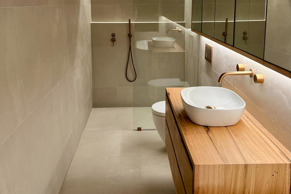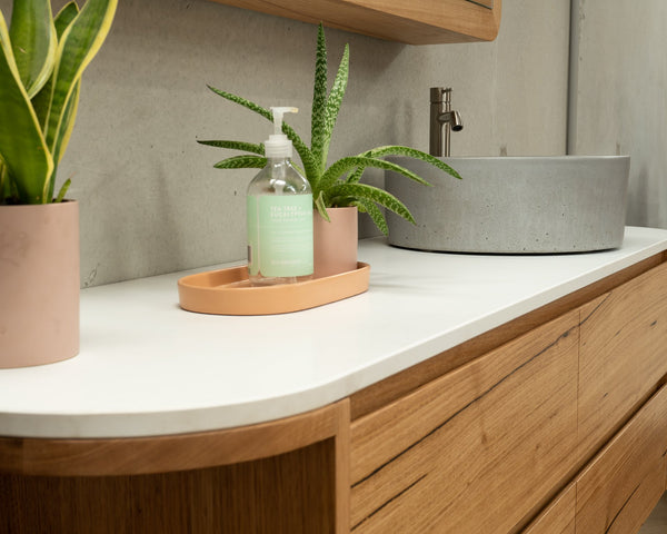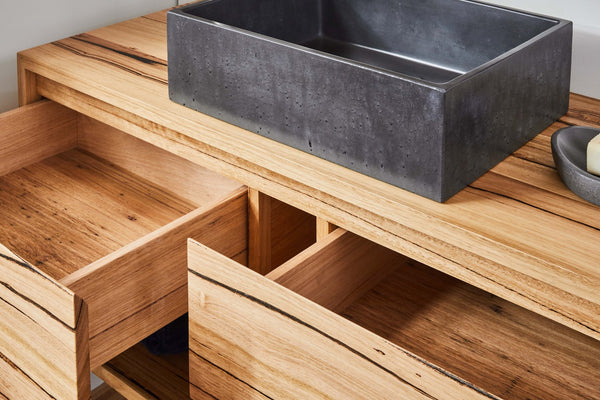 We offer a selection of 7 different timbers for our wooden vanities. These options are either recycled or sustainably sourced with certifications such as FSC. There is the right timber for every different bathroom aesthetic including the pale tones of American Oak, the feature-rich Messmate and the chocolate tones of Walnut.
