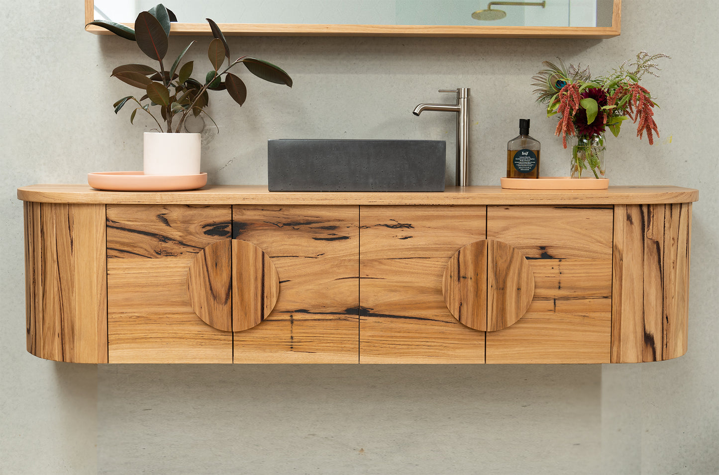The Amity wall-hung timber vanity is crafted from solid hardwood with curved ends and distinctive 240mm diameter round timber handles. Designed to be both bold and balanced, the Amity brings warmth to the bathroom, softening the cooler finishes and sharp edges often found in this space. Built to order by our team of furniture makers on the Victorian Surf Coast, each piece is tailored to suit your chosen timber, size and preferred configuration.