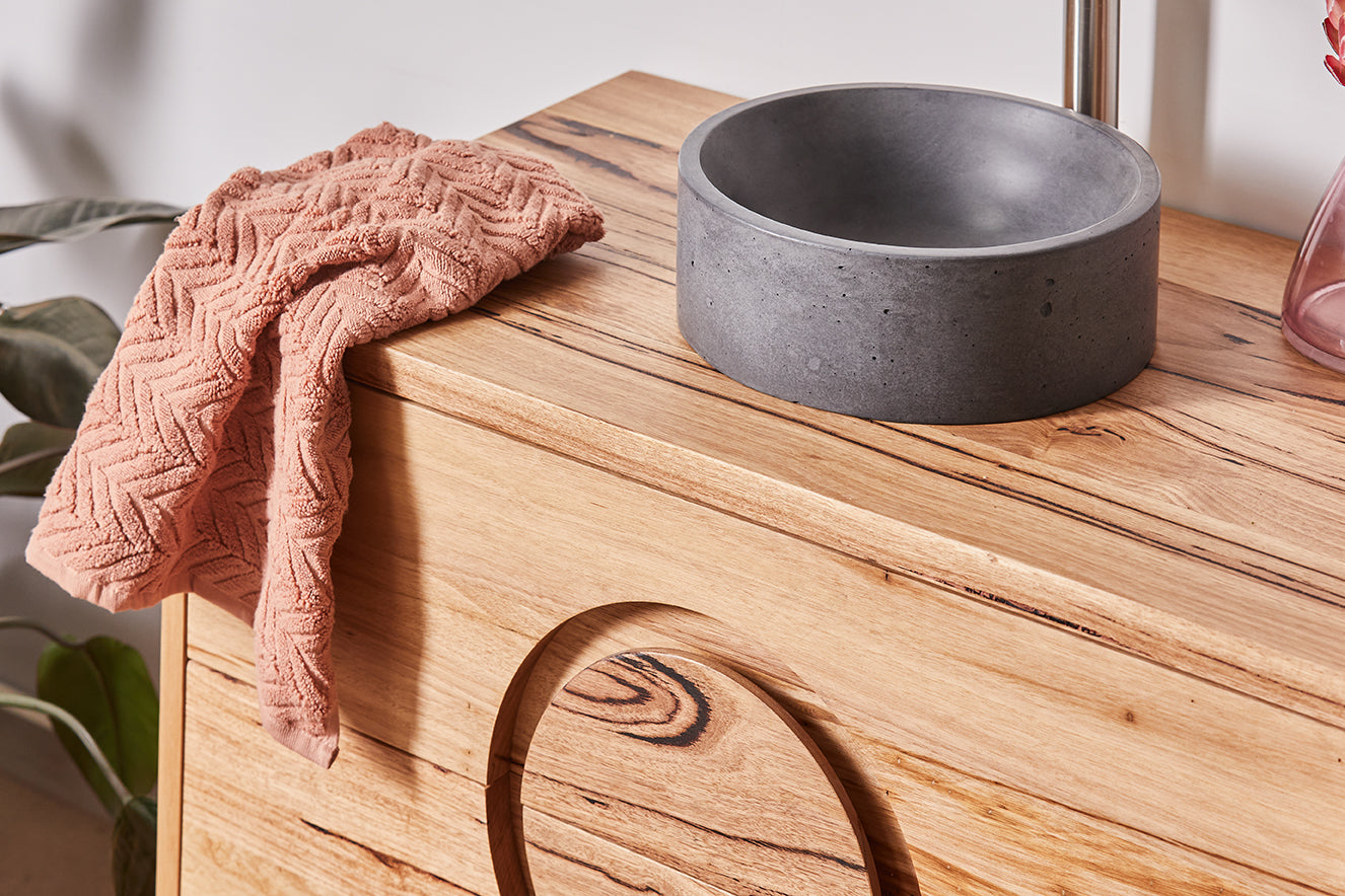 Hand-poured in Torquay, a stone’s throw away from our workshop, the organic nature of this beautiful concrete basin from Mayde is perfect with a solid timber vanity.