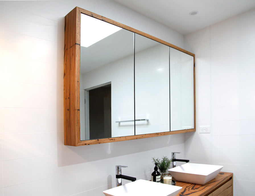 Shown here in recycled Messmate timber, the Iluka bathroom mirror cabinet highlights the natural character and tonal variation of this salvaged material. We also offer this piece in a range of sustainable and carefully sourced hardwoods, including Blackbutt, Tasmanian Blackwood, and American Oak, each with its unique grain pattern, tone, and texture.