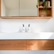 At the centre of the Yamba design is the Omvivo Neo integrated basin and benchtop, offering durability and ease of care for everyday use. Its matte white finish contrasts beautifully against the organic nature of timber, creating a balance between natural texture and refined form.