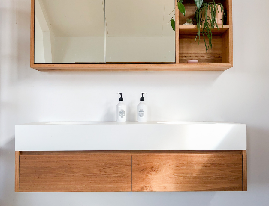 The Yamba is a wall-hung wooden vanity that pairs solid hardwood with the contemporary structure of an integrated basin bench top. Designed as a refined, ready-to-go vanity, it brings together the warmth of natural timber with the modern matte white finish of the Omvivo Neo benchtop into one cohesive design. Handcrafted in our Torquay workshop, the Yamba is available in fixed sizes and built from your choice of our 7 real timber options, allowing you to choose the tones that best complements your bathroom.