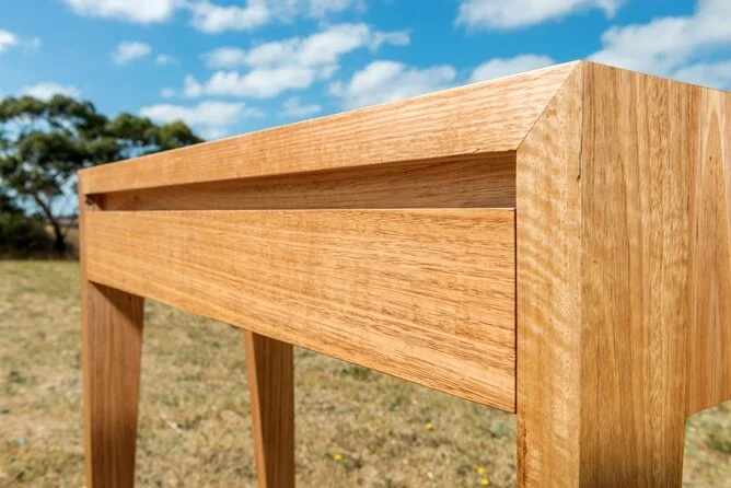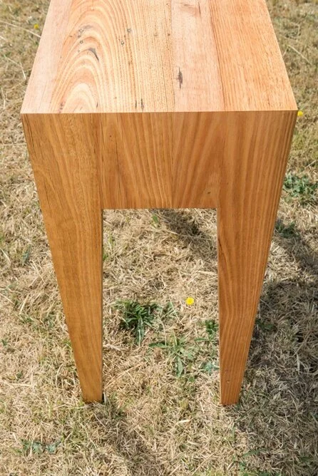 The recycled timber that was used for this particular piece is Tasmanian Oak. It has a light beech like colour with relatively strait grain patterns and minimal natural features of sap lines or pockets. Like all timber, it has a warmth and texture that invites hands to touch.