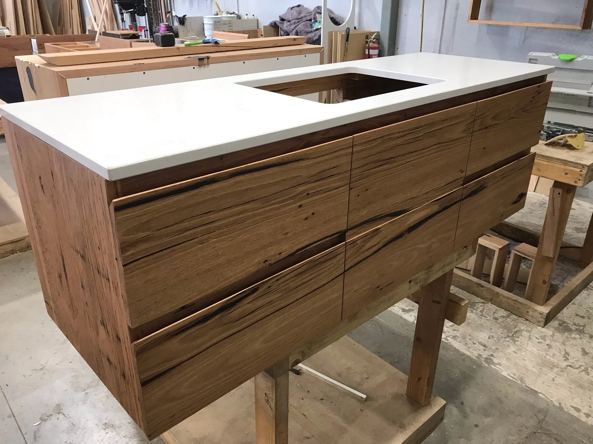 Recycled Messmate Tathra vanity with a stone top ready for the semi-inset basin.